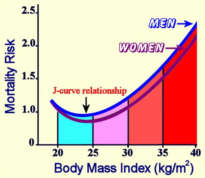 The same J-curve relationship was reported by Bhaskaran et al. (2018) in an epidemiological study using data from primary care records in the UK and death registration data.  The researchers had complete data on more than 3.5 million individuals, and they were able to separate out the population that had never smoked.  They controlled for reverse causality resulting from chronic disease by excluding the first five years of follow-up. The results showed increased all-cause mortality in the low, overweight and obese groups compared to the healthy weight group.  The same J-curve pattern was seen for men and women and for all age groups although the influence of BMI on mortality was strongest in the youngest group.  The healthiest weight for individuals in the study, that had never smoked, was a BMI of 25.